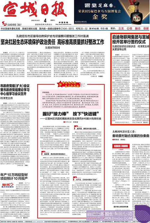 宣城日报报道:8月3日下午,启迪物联网集团与宣城经开区签约仪式在宣举行。宣城市委书记孔晓宏,启迪控股战略发展委员会主任、启迪集群创新研究院院长彭顷砡分别讲话,宣城市长何淳宽主持仪式,宣城市委副书记、秘书长吴爱国致辞,启迪控股、启迪物联网集团负责人及签约企业嘉宾,宣城市领导于静波、宁伟、王普,宣城经开区管委会主任刘家和,宣城市政府秘书长盛浩等参加会谈或出席签约仪式。