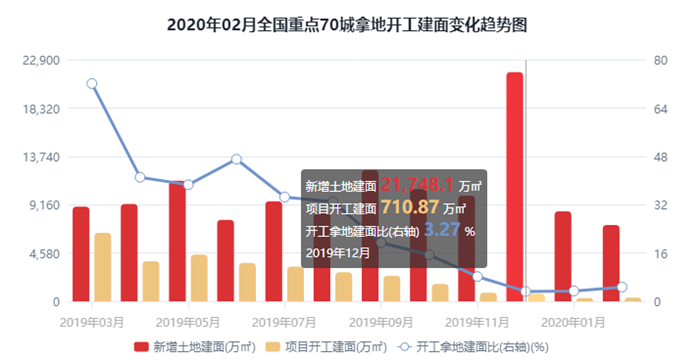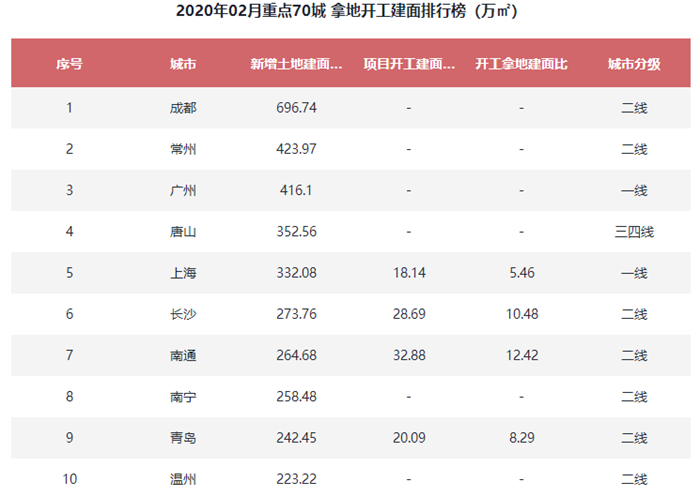 根据有才大数据云平台的监测数据,2020年2月全国重点70城新增土地建面7252.17万㎡,同比减少15.15%;项目开工建面343.25万㎡,同比增加16.73%;开工拿地建面比为4.73%。其中,新增土地建面排在前3位的城市分别为成都(696.74万㎡)、常州(423.97万㎡)合广州(461.1万㎡);项目开工建面排在前3位的城市分别为北京(89.79万㎡)、沧州(43.14万㎡)和南通(32.88万㎡)。